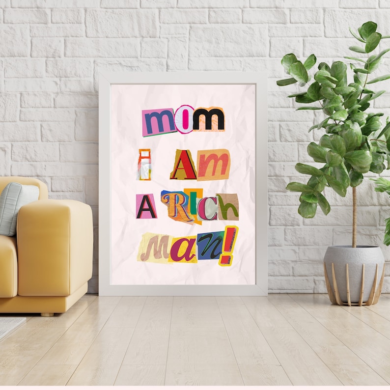 This image beautifully captures the stunning features of Mom I Am a Rich Man Poster Magazine Letters Iconic Sayings Feminist. Whether you are fascinated by exploring this subject further, you'll find an outstanding representation right here, which is sure to inspire and inform. The colors, composition, and subject matter all come together to create a truly remarkable piece of art that you won’t want to overlook.